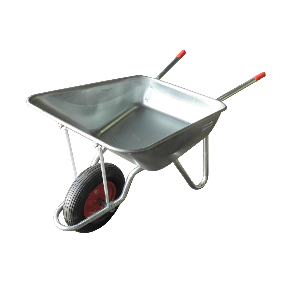 This wheelbarrow has a galvanised steel frame and chassis. The handles have plastic grips for added comfort during use. It’s fitted with a 12-inch pneumatic tyre and has a capacity of 120 litres.
