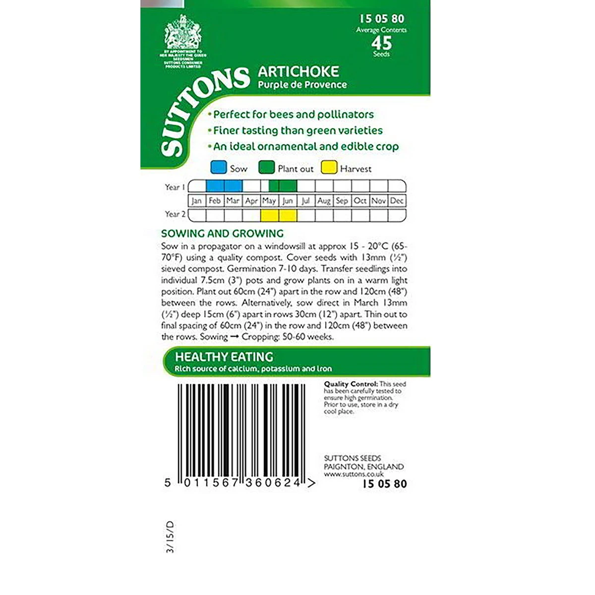 Is as ornamental as it is edible. Allow approximately 60cm between plants in rows about 120cm wide. Crops in second year, and continues for 4 to 5 years. Sow February at 10-15’C, or during March outdoors. Harvest May-June (yr 2).