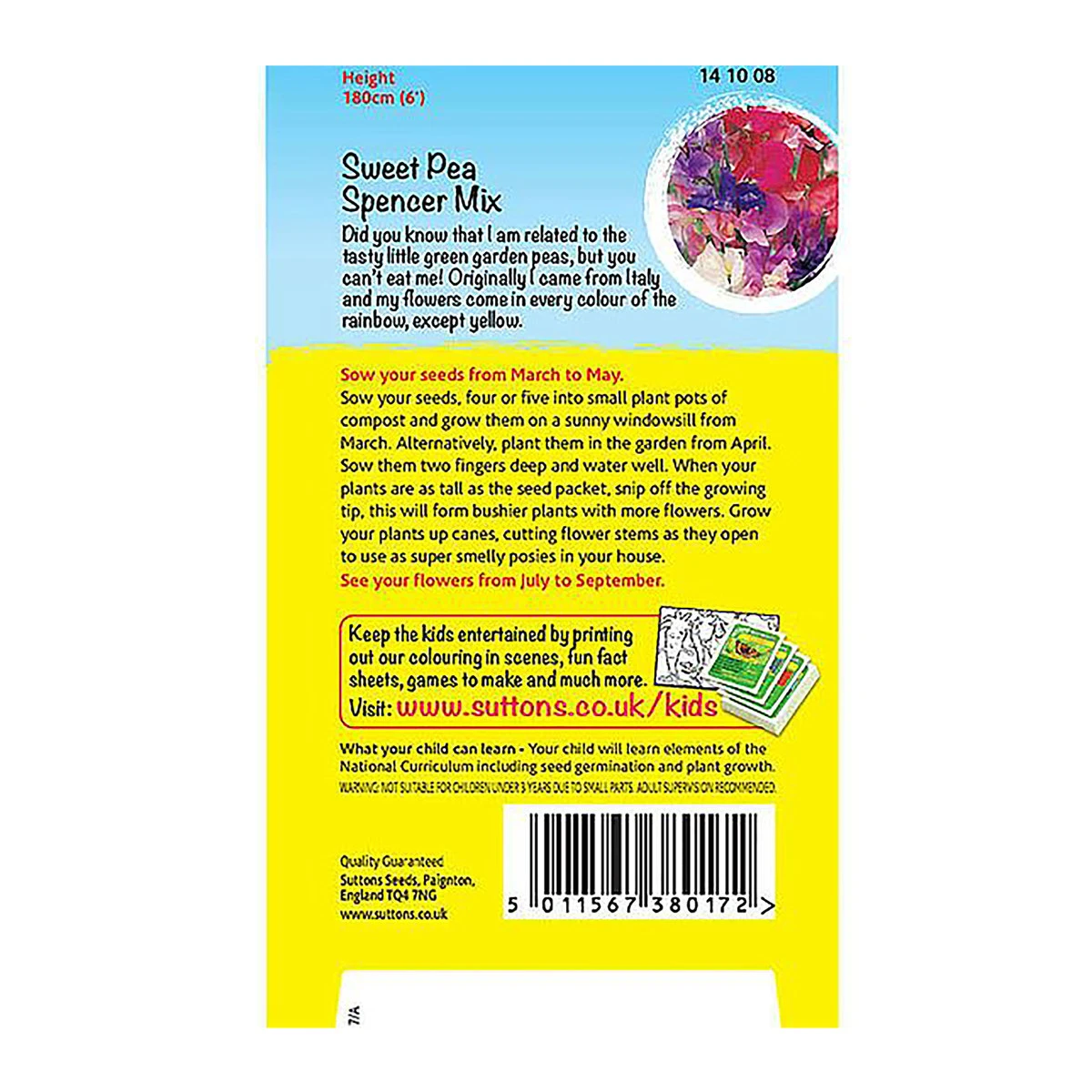 Super easy to grow and colourful sweet pea mix. Great for involving kids in gardening. Growing information: Sow inside on a sunny windowsill from mid March or plant outside in the garden from mid April. Grow 2 fingers deep water well.