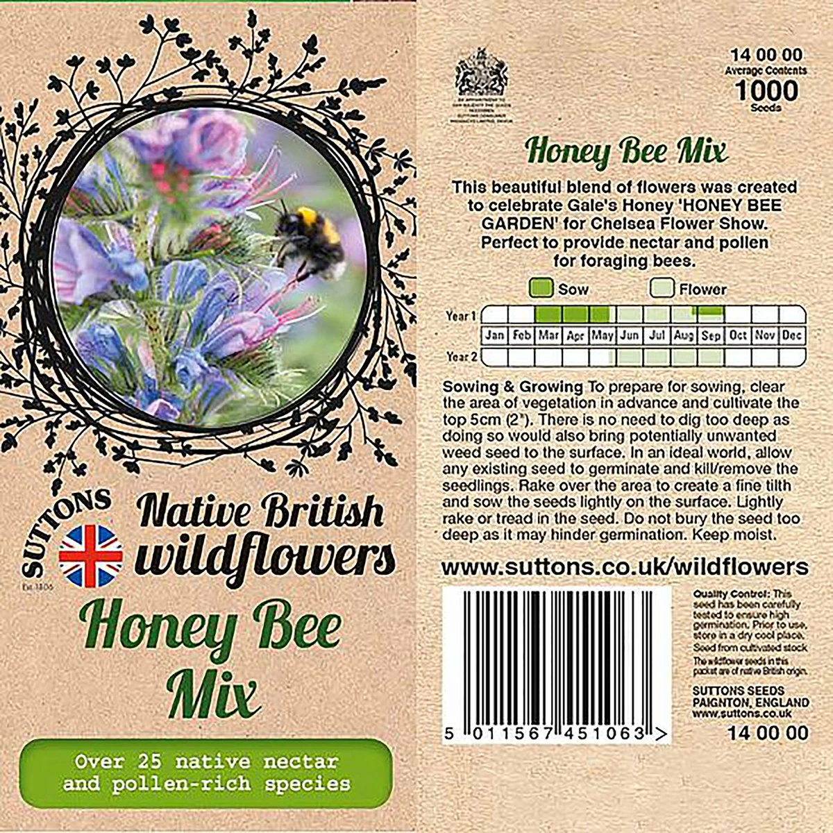 Suttons Honey Bee Mix attracts bees and provides them with nectar and pollen. The seeds can be sown around beehives to increase suitable bee forage. Creates a mixture of flower heights and forms. Growing information: Clear the planting area in advance of vegetation and cultivate the top 5cm. Rake over the area to create a fine soil and sow the seeds lightly on the surface. Burying the seeds too deep may hinder germiantion. Keep area moist for best results