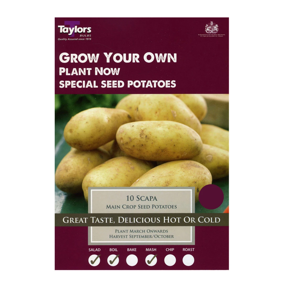 Taylors Main Crop Scapa Seed Potatoes produce long oval tubers with yellow skin and flesh. They are great for mashing and boiling and are delicious hot or cold. Planting time March onwards.