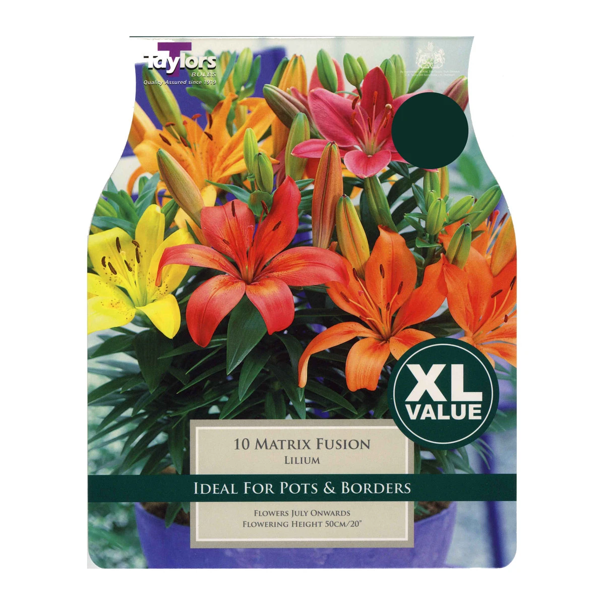 Taylors are a fourth-generation family bulb producer dating back nearly 100 years They are the official bulb supplier for the royal gardens and were awarded The Royal Warrent in 1985. Over the years they have won numerous awards of innovation and quality. Lillies instantly add a layer of tropical elegance to a garden. They have a distinct sweet fragrance which makes them popular in fresh-cut flower arrangements. Lillies are sun worshippers and will fail to thrive if grown in overly shaded areas. They need a rich fertile enriched soil that is free draining. Lilly bulbs like to be planted deeply, approximately three times their own height below the surface. If you choose to cluster plant, it is recommended to dig a single large wide area and position the bulbs at least 15cm apart. Lillies will thrive in both ground planting and containers once the container is at least 25cm deep. Bulbs can be planted more tightly together in a container in order to grow into a thick dense display. Lillies have a large flowering head and often become top heavy. In windy areas it is advisable to improve stability of your plant by staking them to prevent heads snapping off. Lillies use a lot of energy and nutrients producing the impressive flowers so will require regular feeding with high potassium plant food or tomato food at least every two weeks. Continue feeding after flowering to help bulbs grow nice and strong for use next year. Deadhead your Lilly on a regular basis to avoid energy being used on seed production instead of flower production. These bulbs will produce small to medium Lilly plants with flowers in stunning bright vivid colours. They instantly add a blast of exciting interesting beauty to any garden, household and balcony. They will grow to a very manageable 50cm height and flower from July onwards.