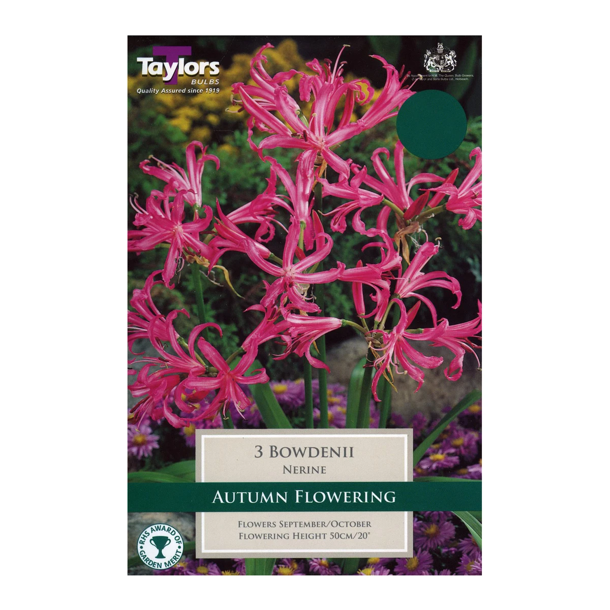 Nerine Bowdenii is an autumn flowering and is pink in colour. It is an RHS award winner and is ideal for cut flowers. Nerines like full sun and a well-drained soil containing plenty of organic material, they should be planted from March onward for September or October flowering. They are best for planting in borders and outdoor containers.