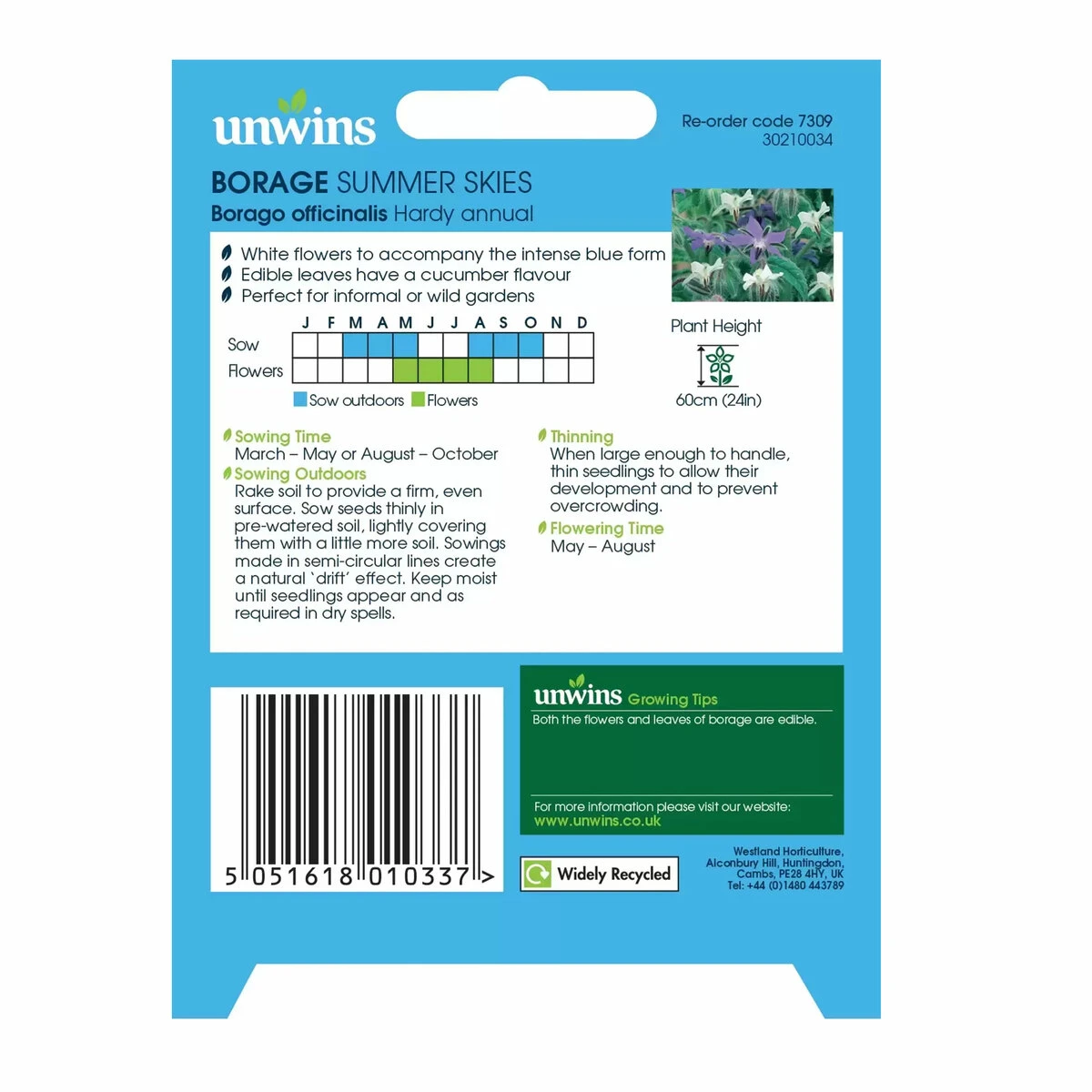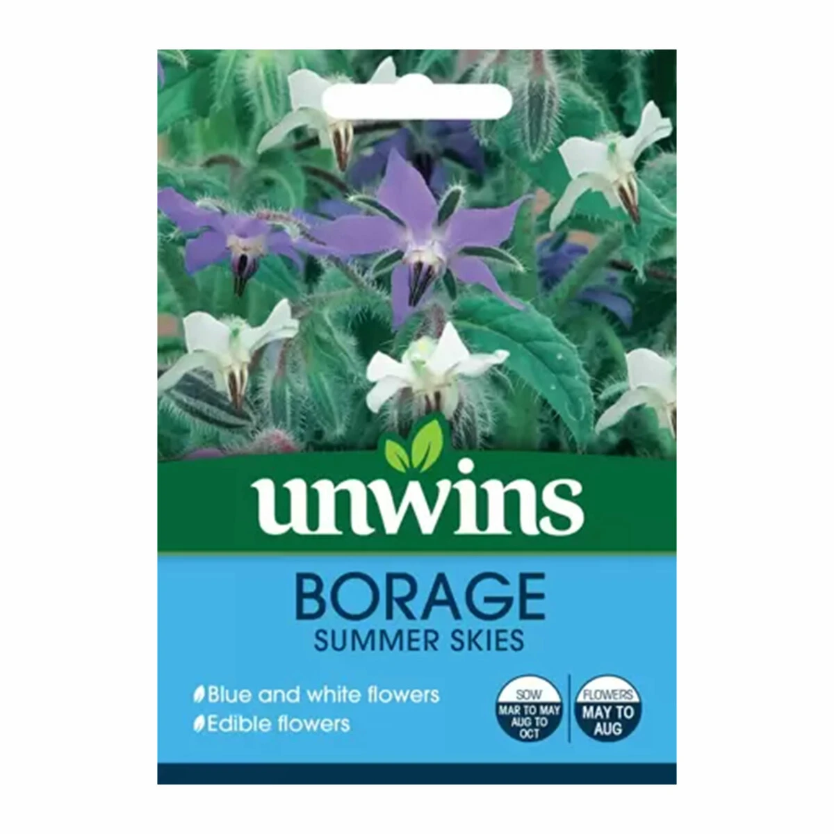 To complement the more common, bright blue variant of our borage, it also has white blossoms. The leaves are edible and have a cucumber flavour. The blossoms are a classic garnish for cool summer drinks. ideal for natural or informal gardens.