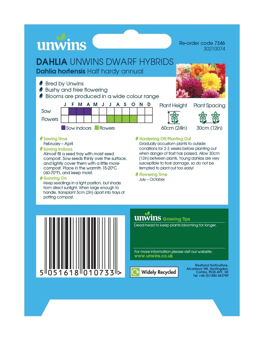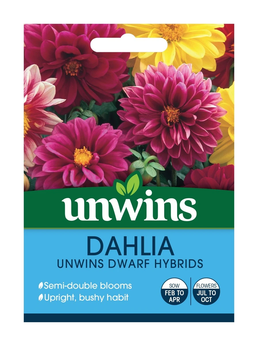 The plants are bushy and free flowering, and the blooms are produced in a wide colour range. They are great for bedding. This classic seed raise dahlia mixture, are bred by Unwins and are grown all round the world.