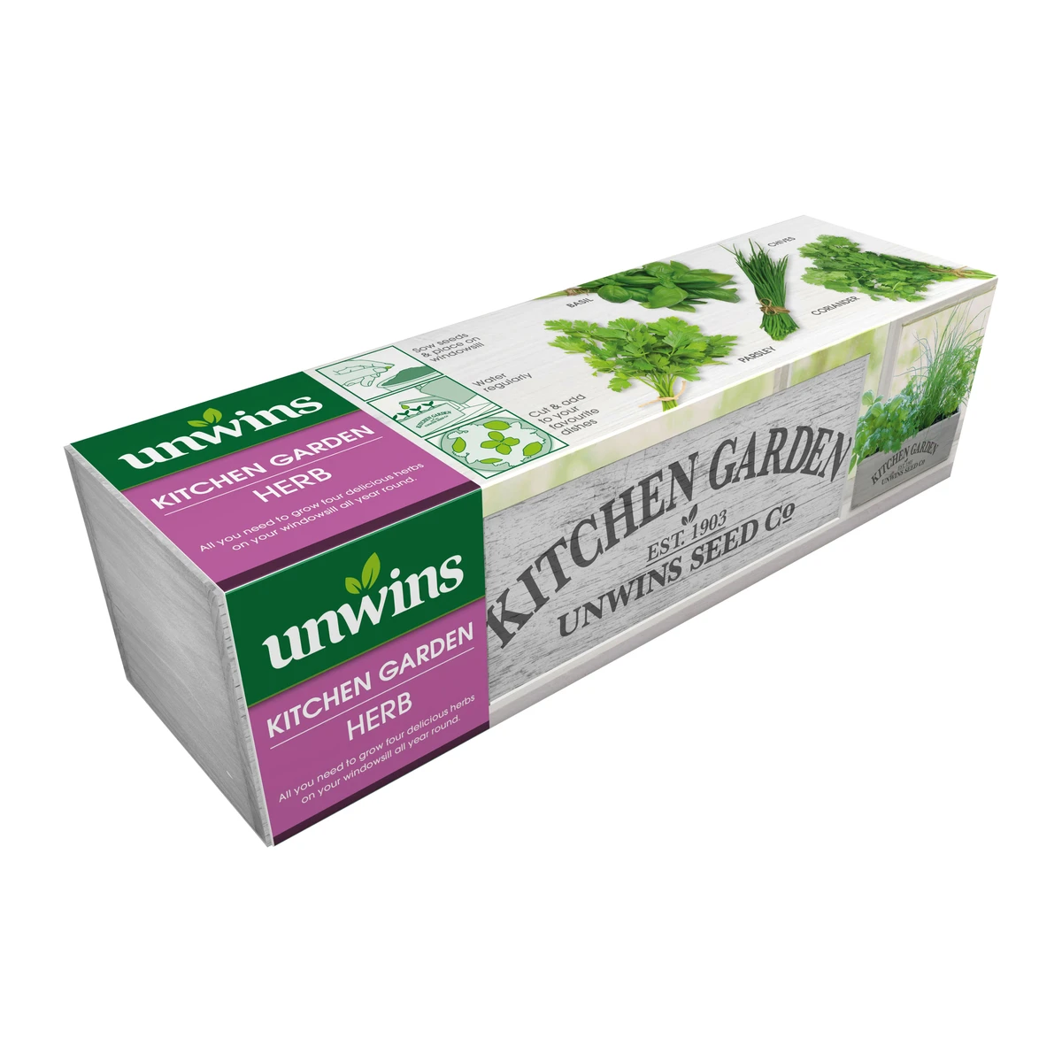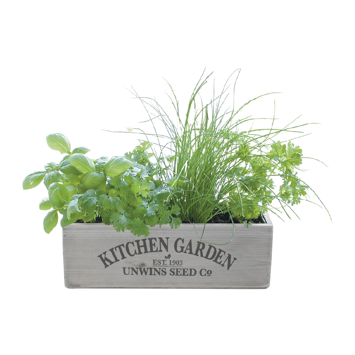 The Unwins kitchen garden herb kit is the perfect kit to add to your kitchen. This herb trough will have your herbs in reachable distant to add all the flavours to your dishes. The Unwins kitchen her kit comes with four delicious and popular kitchen herbs for growing on the window sill or light and bright room within your home. The herbs are ‘cut and come again’ varieties so just pick regularly and new shoots will grow again and again which will ensure you never run out of your favourite herb. The compost within the trough is a nutrient rich, moisture retaining blend of compost which promotes good germination and plant growth, whilst preventing drying out during the day and enabling easier re wetting once dry. The kit comes with four plastic pots that fit neatly into the wooden trough which is painted in a modern grey wash effect. The trough is printed with a Kitchen Garden logo on one side. The wooden trough is lined to prevent water seepage onto your furniture and preventing the exterior trough getting wet. Within the Unwins kit there are enough seeds for 2 sowings of each variety whilst also giving you spare seeds that you can store in a cool dark place until they are required to be sowed again. The Unwins kitchen herb garden Kit comprises of: 4 packet of seeds. 1 of each of the following herbs Basil, Chives, Coriander and parsley curled. You receive a lined wooden grey painted trough, 4 plastic pots, nutrient rich compost and instructions.