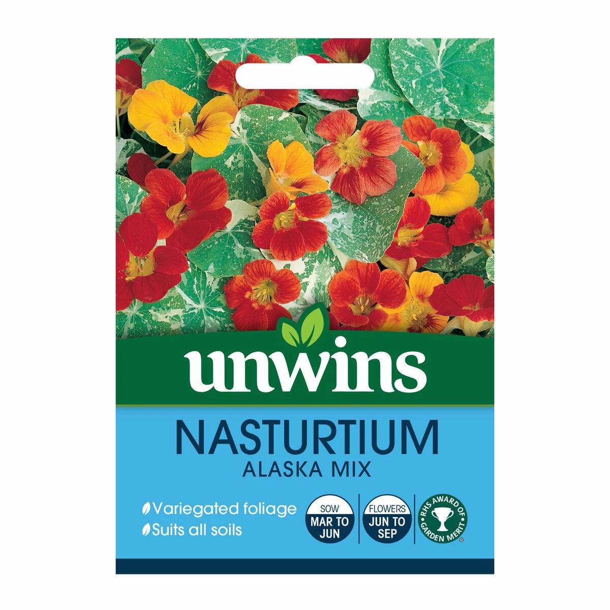 A mixed coloured flowering Nasturtium variety that also has beautiful green/white leaves. Alaska Nasturtium is quick and easy to grow. Sow the seeds in pots/seedling modules or directly into their final place in the garden. The seeds will germinate after 7 to 14 days, and will grow quickly from there. Both the flowers and the foliage have a peppery flavor and are edible. Bees find the blossoms to be highly alluring as well.