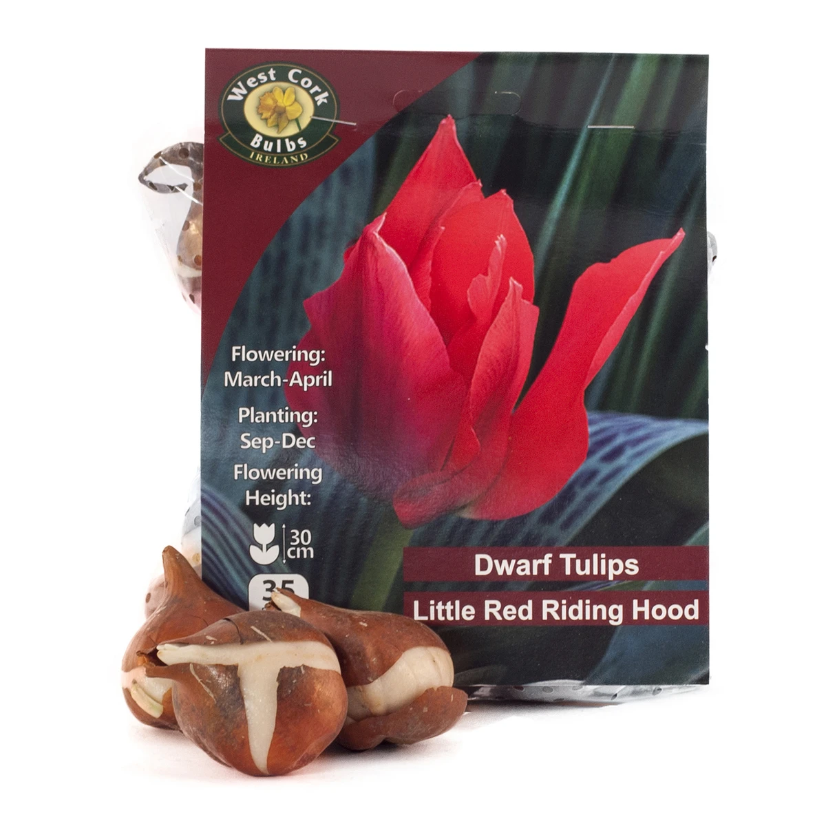 This Red Riding Hood tulip is ideal for borders or window boxes. Dark red colour with striped leaves, it is one of the most appreciated dwarf tulips. The full growth height of this flower is 20cm and planting time is from September to December.
